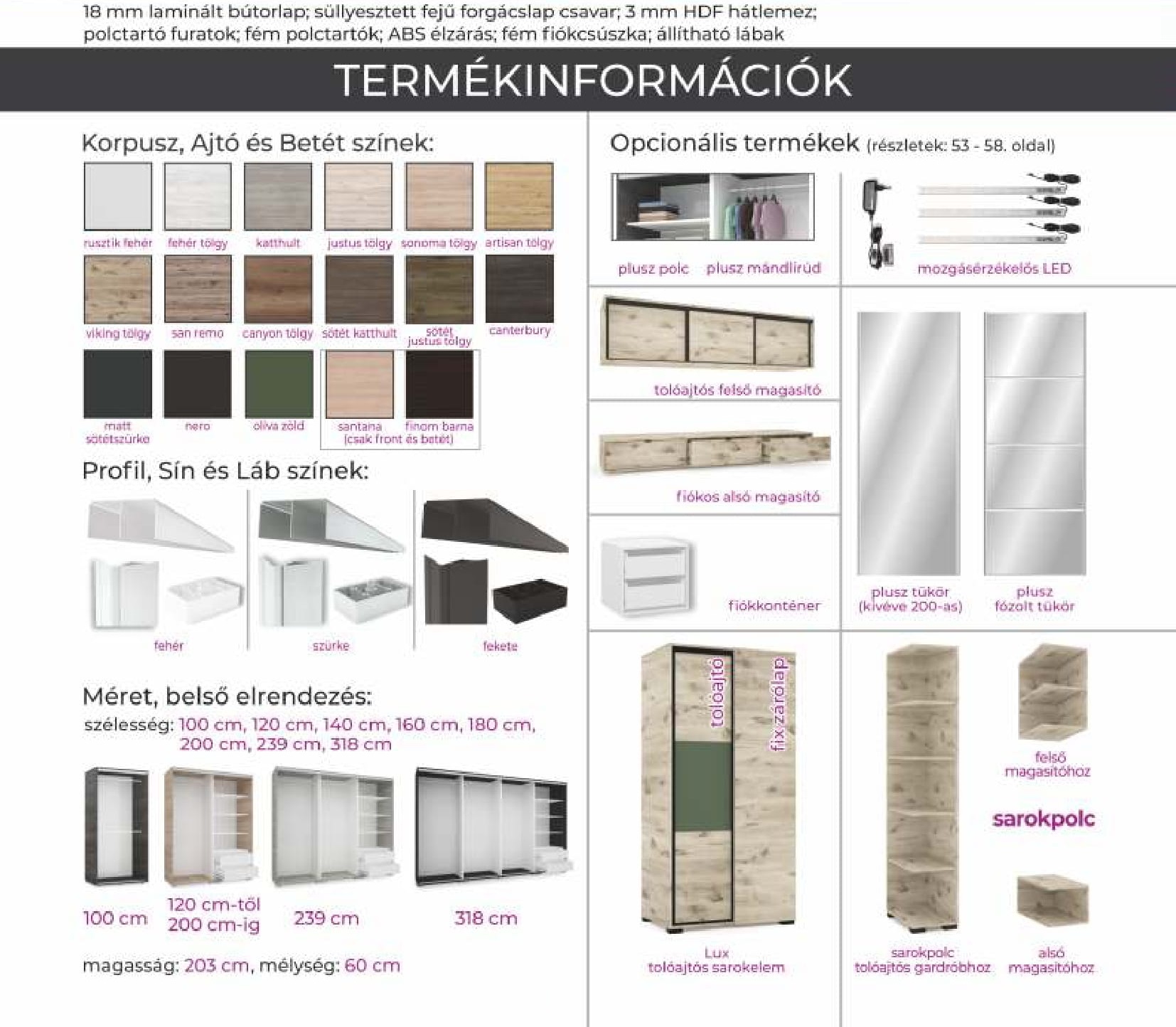 KORPUSZ ÉS FRONT SZÍNEK | artisan tölgy, canterbury, canyon tölgy, fehért tölgy, justus tölgy, katthult, matt sötétszürke, nero, oliva zöld, rusztik fehér, san remo, sonoma tölgy, sötét katthult, viking tölgy |