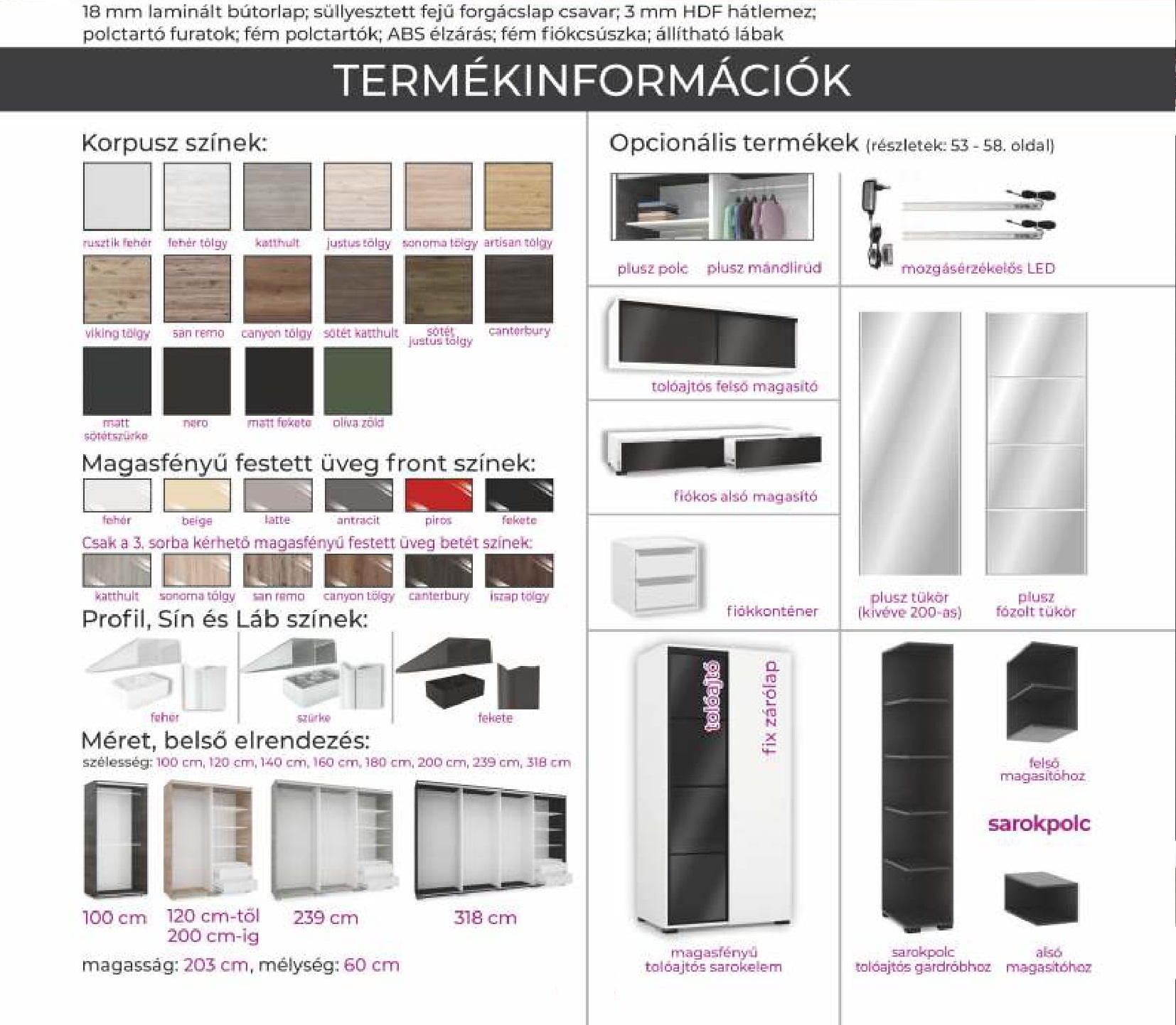 KORPUSZ ÉS FRONT SZÍNEK | artisan tölgy, canterbury, canyon tölgy, fehért tölgy, justus tölgy, katthult, matt fekete, matt sötétszürke, nero, oliva zöld, rusztik fehér, san remo, sonoma tölgy, sötét justus tölgy, sötét katthult, viking tölgy |