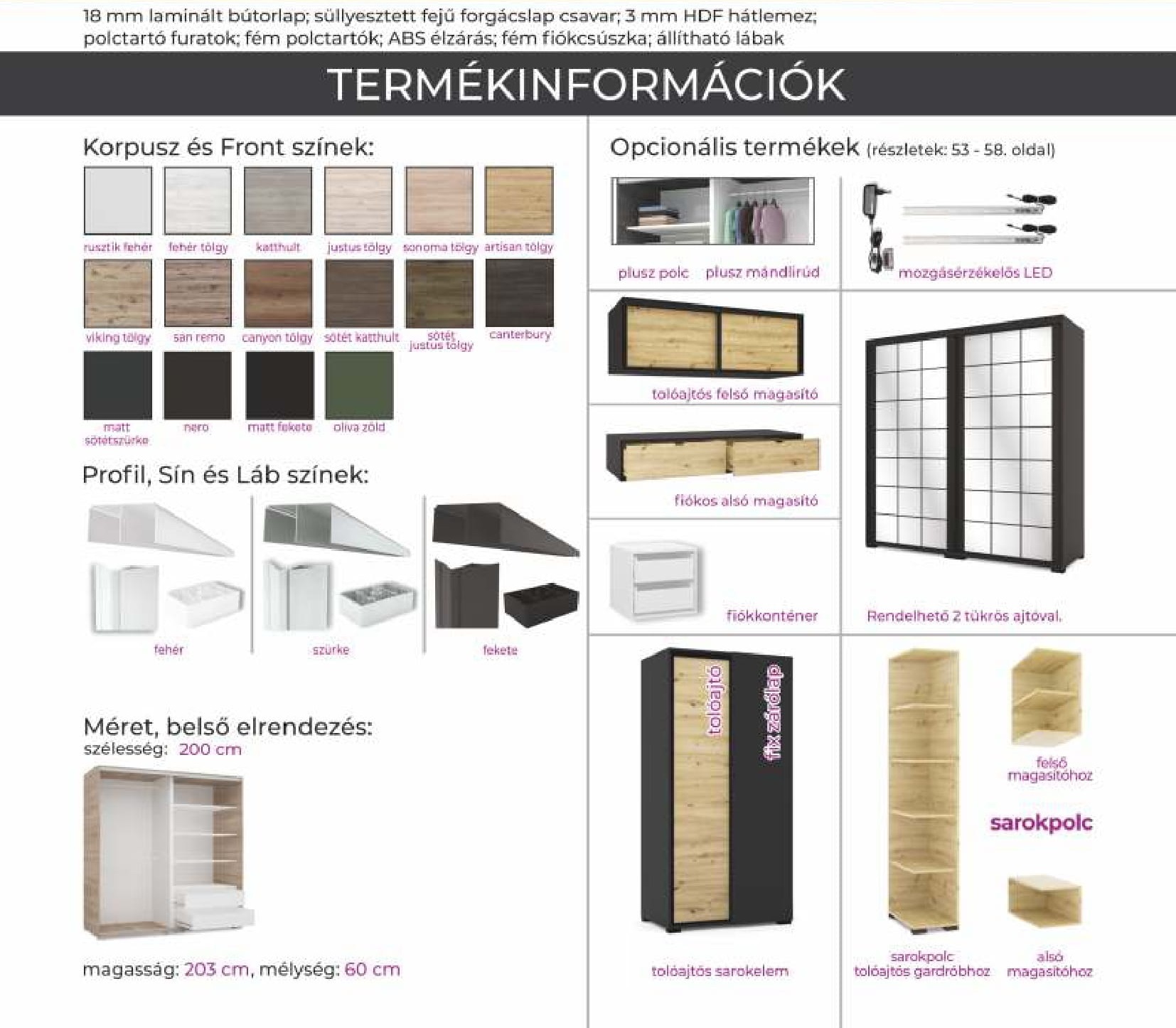 artisan tölgy, canterbury, canyon tölgy, fehért tölgy, justus tölgy, katthult, matt fekete, matt sötétszürke, nero, oliva zöld, rusztik fehér, san remo, sonoma tölgy, sötét justus tölgy, sötét katthult, viking tölgy