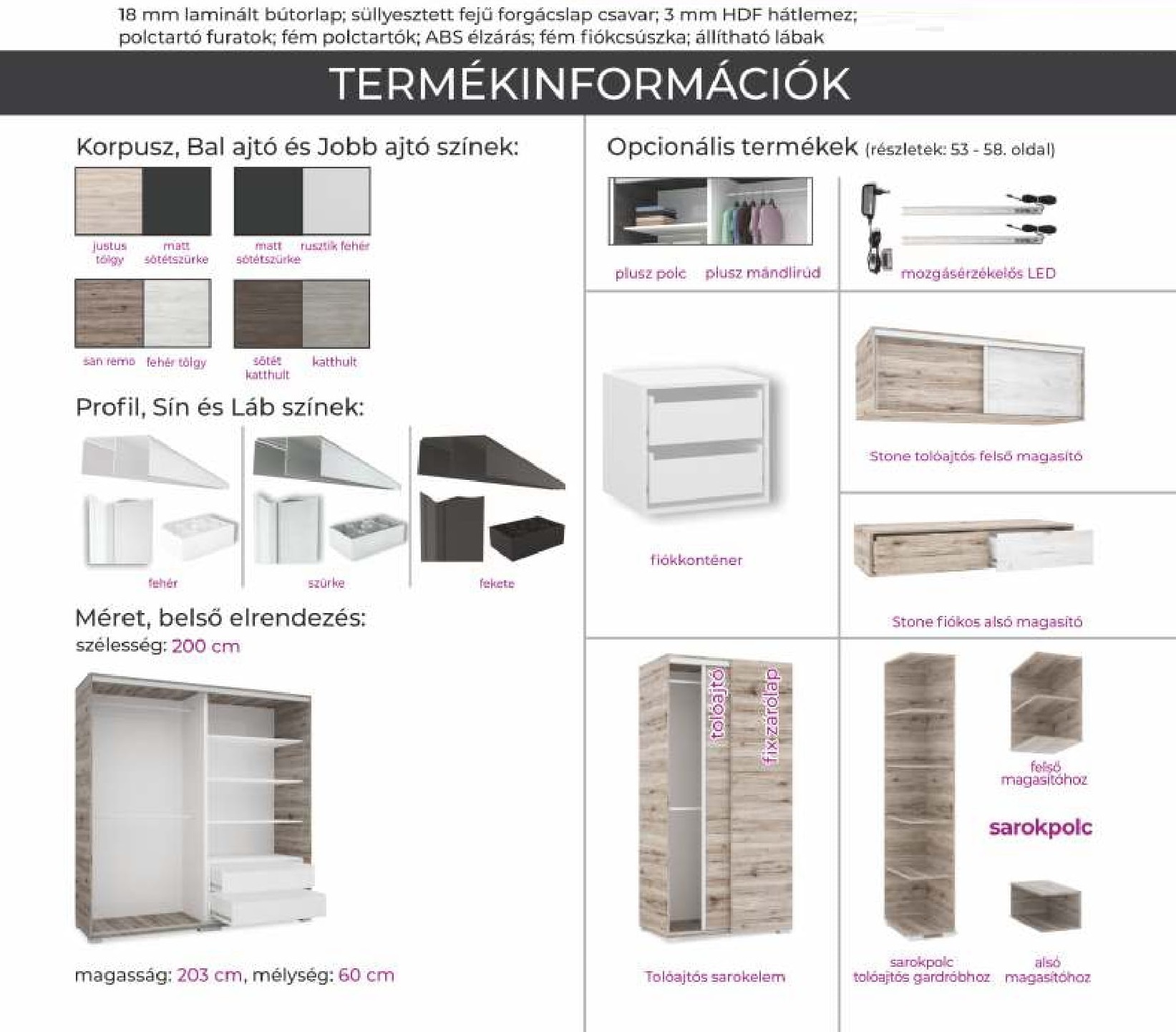 KORPUSZ ÉS FRONT SZÍNEK | fehért tölgy, justus tölgy, katthult, matt sötétszürke, rusztik fehér, san remo, sötét katthult |
